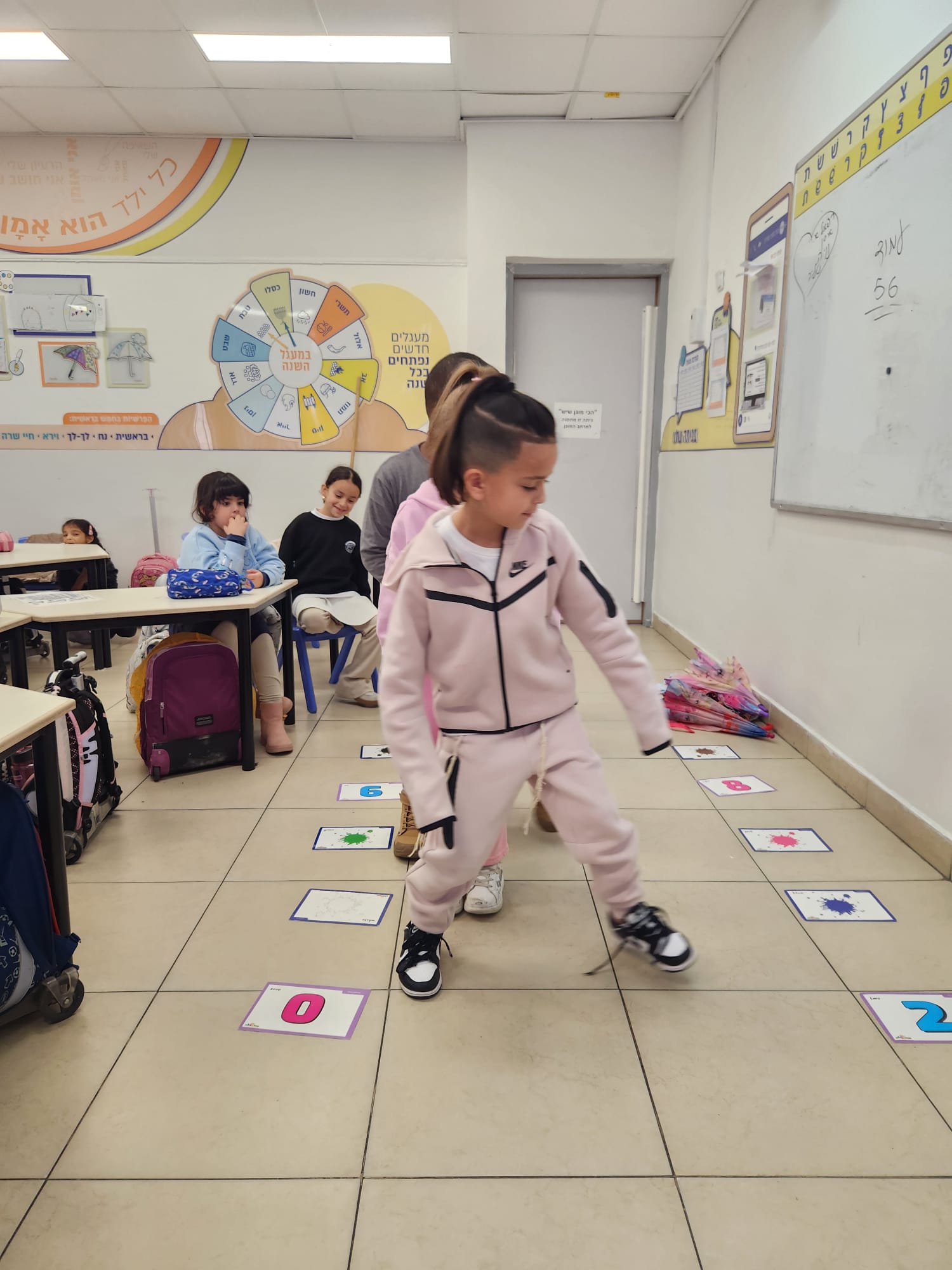 תלמידה מלמדת את חבריה לכיתה תנועות באנגלית.